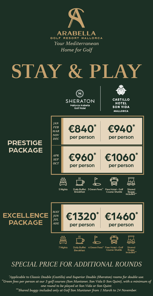 Play on our three prestigious courses – Son Vida, Son Muntaner and Son Quint – while enjoying the hospitality of a 5-star hotel. With breakfast, green fees, transfers and exclusive extras included, everything is prepared for your perfect golf escape.